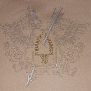 Silver graphic on front with gold colored flocked lettering.