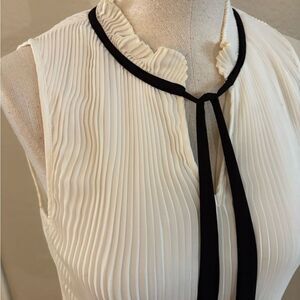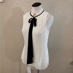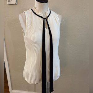 DKNY Pleated White Sleeveless Top with Black Tie Detail Sz Small