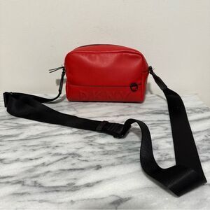 Bold red DKNY belt bag. Features adjustable black strap. Perfect for essentials.