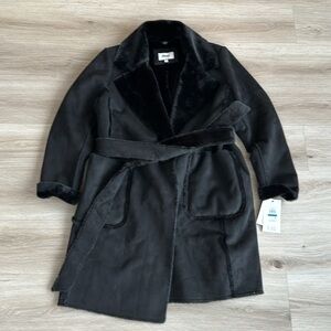 Get into this petite faux-suede coat from DKNY designed with gorgeous faux-fur trim and two oversized patch pockets.