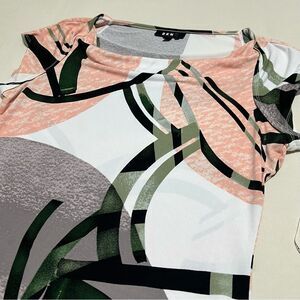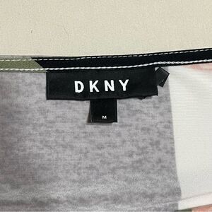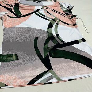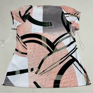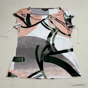 Stylish DKNY blouse with abstract pink and green patterns. Short sleeves and a modern look.