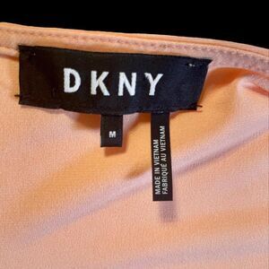This is a sleeveless blouse by DKNY done in a peach color. Size Medium. 95% polyester and 5% spandex. 3 white pearls at top (see photos). Top measures 25.5” long. Armpit to armpit measures 20.5”. Item is Preowned and in good condition. The only thing to note is some difference in threading. See the last pic and you will see what I mean. Not real noticeable. Contact me with any questions!