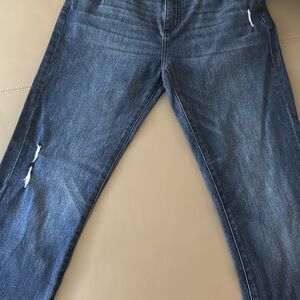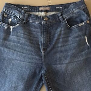 DL 1961 Brady slim dark nebulous distressed straight leg jeans. Size 18. Fits true to size. Designed for a slim straight fit. Zip fly with button closure, belt loops, 5 pocket silhouette, tonal stitching, silver hardware.