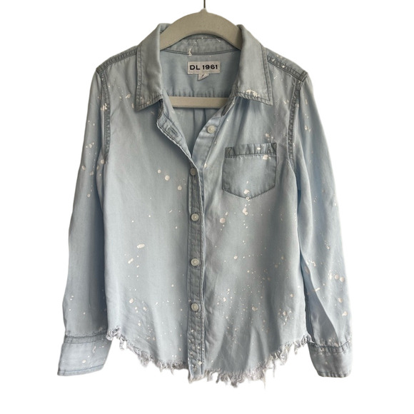 DL1961 Kids Button Down Short. Size 5. Edgy and cool with frayed bottom. Design has white paint splatter. Excellent condition like new! Purchased through boutique so it’s a unique piece!