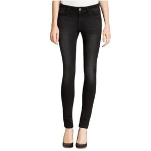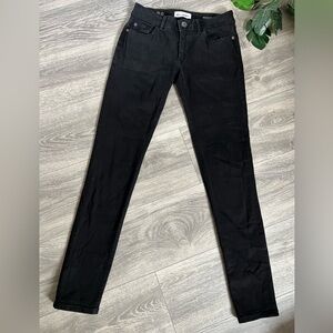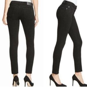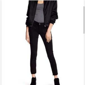 Mid Rise ankle jean, skinny silhouette in black, classic five pocket styling, belt loops, zip fly with button closure.