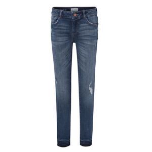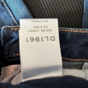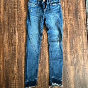 Good used condition with minimal signs of use. 5 pocket styling with intentional distressing. Raw hem, stretch denim.