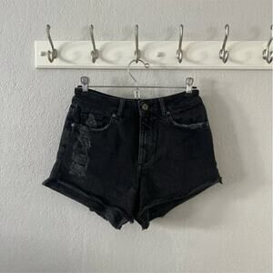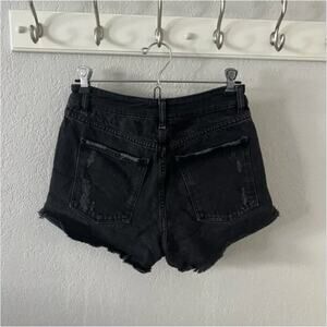 In good preowned condition. Distressed black wash high rise cut off denim shorts.