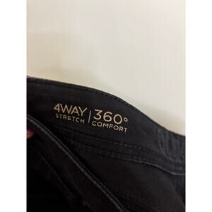 DL1961 Coco Curvy Slim Straight Jeans in Onyx black featuring 4 Way Stretch and 360 Comfort technology. Made from a premium blend of 73% cotton and 27% polyester for durability and comfort. Designed with a curvy fit, mid-rise, straight leg silhouette, five pocket design, and zipper fly with button closure. Good pre-owned condition with minor wash wear and some paint scratching on the button.