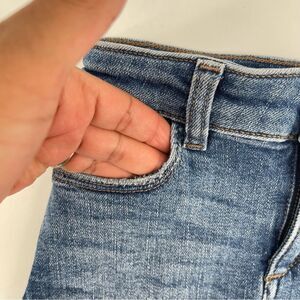 Perfect fit, mindfully made. Snap button and zipper fly front closure. Inner adjustable waist tabs. Pockets. Frayed hem. Embroidered logo on back pocket. Cotton, Spandex.