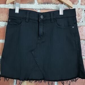 Black, denim mini skirt from DL1961. The fabric on this is soft thanks to the Tencel blend fabric. Classic five pocket styling. Button front waist closure and zipper fly. Raw hemline. Pre-owned and in good condition. No visible flaws. In girl's size 12.