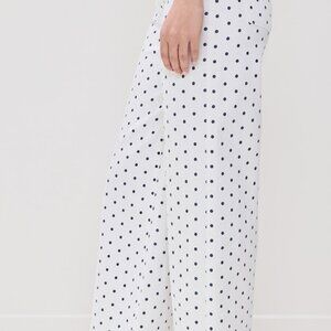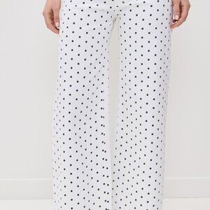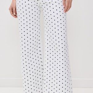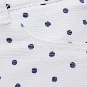 Designed with a high rise and a cropped wide leg. White low-stretch denim with blue polka dots. Fit TTS and will soften and give with wear.