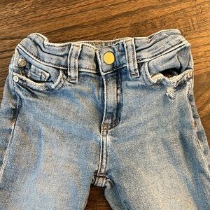 Straight leg, medium wash boyfriend jeans for little girls with distressing throughout by DL1961 Premium Denim. Adjustable waist tabs. Size 6. There’s a hole at the corner of one of the back pockets — see photos.
