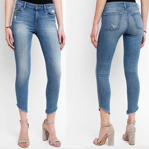 Strive for more in your denim. By DL1961, these Margaux in Acetate skinny jeans lend something truly unexpected with a raw asymmetrical hem, light washed, factory distressed denim, and mid-rise fit.