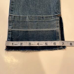 Front zipper and button Waist 13” Inseam 27” Rise 10” 98% cotton 2% lycra Light fading and whiskering High rise Unfinished hem Lower leg slits Ankle Premium quality denim