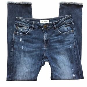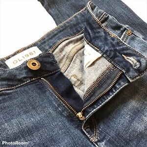 DL1961 Mara Intasculpt ankle straight leg jeans Ravine wash. Mid-rise; classic five-pocket styling; button fly closure; ankle length; straight leg; intentional distressing, fading & whiskering; applied raw hem edge for a perfectly frayed look.