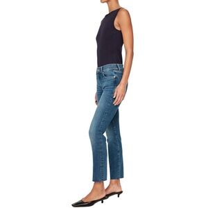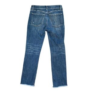 Tags: blue denim, denim, jeans, straight leg, mid rise, frayed hem, slimming, smoothing, sculpting, ankle length, ankle, crop, date, night, weekend, casual, premium, luxury, 90s