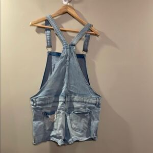 Classic denim overalls with adjustable straps. Features a front pocket and side buttons. Distressed material had a good bit of stretch to it.