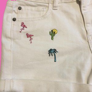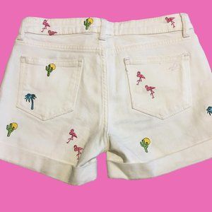 • White shorts with embroidered flamingos, cactus, & palm trees