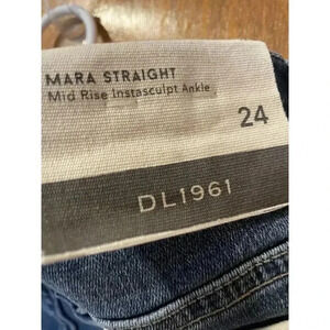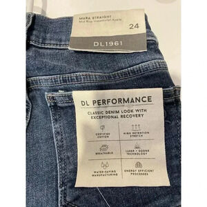 DL1961 Vintage Emilie Straight Ultra High Rise Button Fly Jeans are in size 24, made of denim fabric with distressed accents, a raw hem, and a logo. They have a high rise and a 5-pocket design. The style is straight with a medium wash and a vintage theme. These 100% cotton jeans by DL1961 have a regular fit and feature a button fly. Perfect for all seasons, they are brand new without tags.