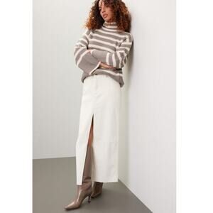 This DL1961 women’s off-white Asra Ecru maxi skirt combines classic denim structure with a modern, refined silhouette. Crafted from a soft cotton blend, it offers durability with a comfortable, breathable feel. The off-white ecru shade provides a clean, versatile base that pairs effortlessly with a variety of tops and footwear. Designed with a high-waist fit and a full-length maxi cut, it creates a sleek, elongating effect. Subtle seam detailing and a front slit add a touch of sophistication and ease of movement. Perfect for casual daytime styling or elevating with heels for a chic evening look. A timeless piece that blends comfort, style, and versatility.