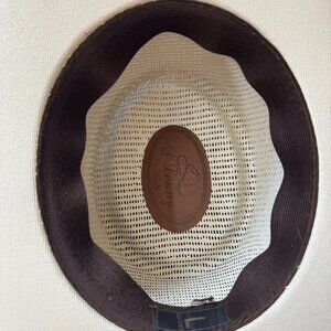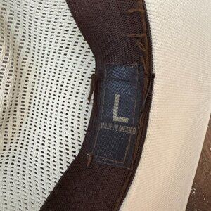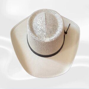 Lightweight white/ivory western hat with a vented/mesh crown for airflow and a solid brim for sun coverage. Classic telescope/gambler crown with a black hatband and knot detail. Marked L – Made in Mexico (fits roughly US 7¼–7⅜ / 58–59 cm; see tape-measure photos for interior dimensions). Comfortable sweatband; clean and ready to wear. Great for rodeos, ranch days, festivals, or concerts.