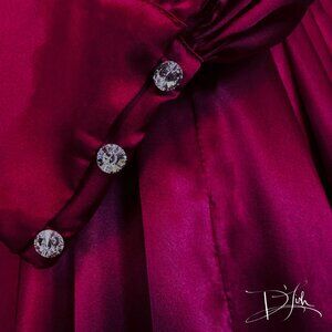 "The Beverly dressing gown embodies pure extravagance with dramatic sleeves and fitted cuffs for a classic boudoir feel reminiscent of Hollywood’s golden era. The skirt is extremely full, and the three large crystal buttons on each cuff perfectly enhance the luxuriousness of the fabric. The soft, sleek charmeuse drapes beautifully around the bodice, and nips in at the waist with a sexy sash. Pure decadence both inside and out, the gown is lined with the same delicious charmeuse on the inside, and the sensuously sweeping skirt is a full circle shape, ideal for impromptu dance numbers around the house! All this and pockets too!"