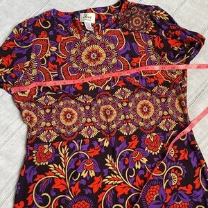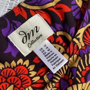 DM Collections Multicolored Shift Dress. Size 12. Pull on. Material is lightweight and stretchy. Vibrant floral dress with intricate patterns. Features quarter length sleeves and a round neckline. Perfect for a bold, stylish look.