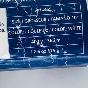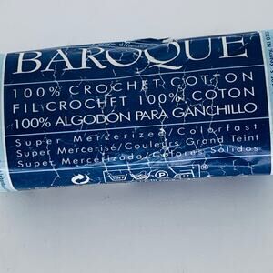 "DMC Baroque Crochet Thread, size 10, in white, made from 100% super mercerized cotton for a smooth and durable finish. Colorfast with lot number 165527, this thread is ideal for delicate crochet projects. Partially used, but the remaining thread includes the original paper sleeve. Perfect for fine detailing and crafting."