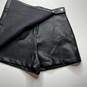 D'Mode Classix shorts with skirt front panel. Pleather material. Hanger marks on the waistband. One zipper pocket. Zipper closure on the shorts and two snaps on the skirt part. Solid black with silver hardware. 100% polyurethane. Wipe clean. Juniors size 9.