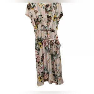New with tags DN Design dress in size 22W. Features a pink, yellow, and green floral design, V-neck, and short sleeves. It has a zipper back and the color is blush gold. P520 59