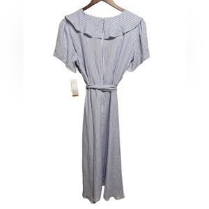 Beautiful blue & white striped midi length dress with a feminine ruffle down the front and a belted tie to accentuate the waist. This dress is perfect for a summer wedding, shower, or day date with your favorite guy. It is lightweight and sheer, but not see through.