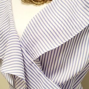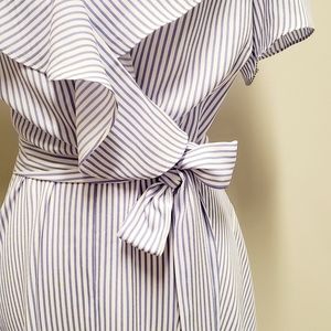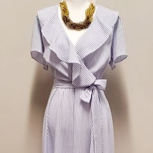 Blue and white stripes define this dress from DN Designs by Danny & Nicole, featuring a deep ruffle V-neckline and a tie waist.