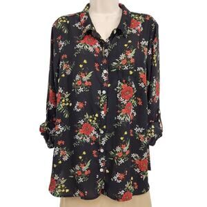 DNA Couture Blouse Women's Plus Size 2X Black Long Sleeve Floral Button Collar