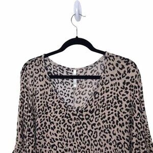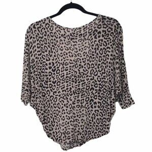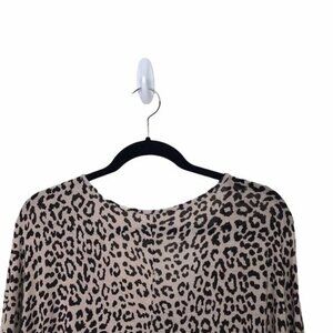 Tan / Beige animal print top with rounded v neckline, animal print, and rounded hem. Thin and lightweight. Preowned but in good condition.