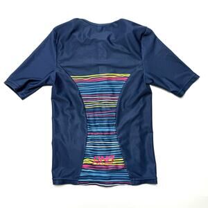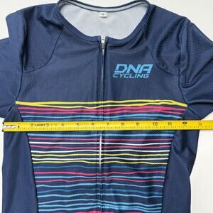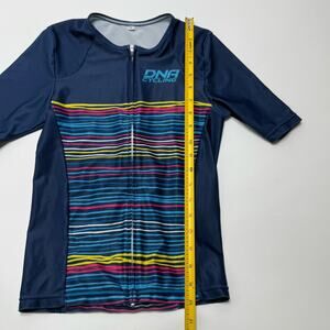 DNA Cycling Jersey Womens S Navy Striped Full Zip Polyester Pink Yellow Pocket on back
