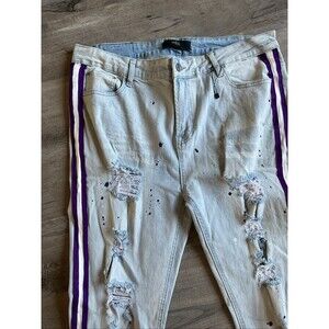 DNA Denim Skinny Distressed Jeans 38 Biker Grunge Moto Purple and White Stripe