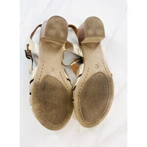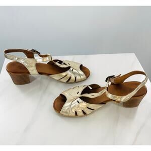 DNA Footwear Bergen Sandals Peep-Toe Metallic Gold Sandals, Wood Heels T-Strap