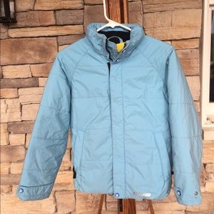 Light blue with detachable hood. Zipper pockets, zipper and Velcro closer. Lining has two mesh pocket and extra waist snap for more secure fit. Very little wear.