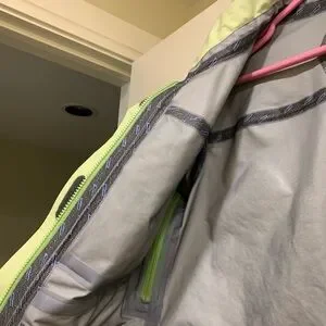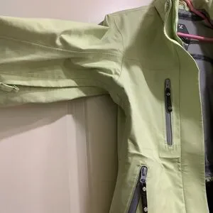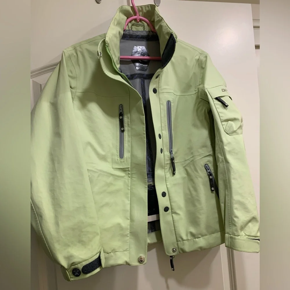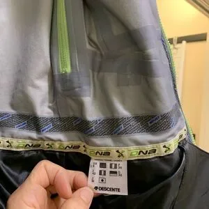 Descente brand high end winter waterproof shell for outdoor sports. All zips and pockets fully sealed & functioning smoothly. Pit zips, fully removable hood fits helmets, in great shape but no need for 3 shells in closet !