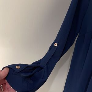 D.N.A. Couture long sleeve soft navy blouse with tie up sleeves w/ gold buttons pit to pit 21 length 28