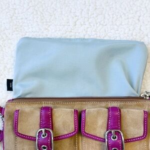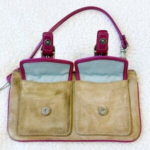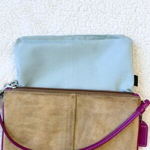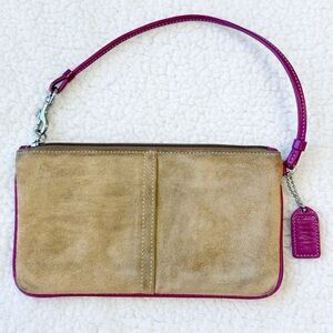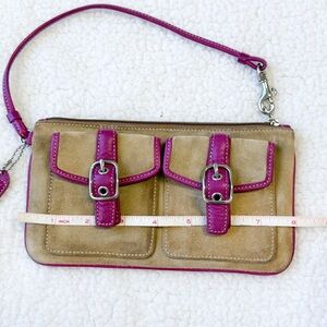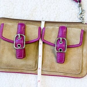 This vintage Coach double pocket wristlet is in good used condition! There is discoloration across the suede and some very small staining on the inside liner. Measurements are included in the photos. No smells or odors, smoke free and pet free home.