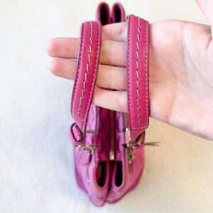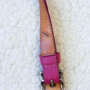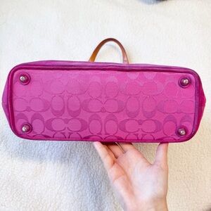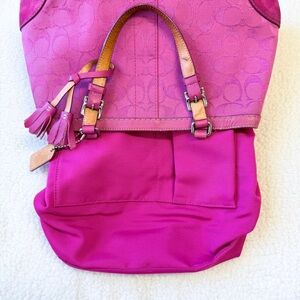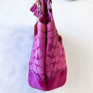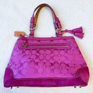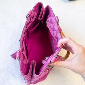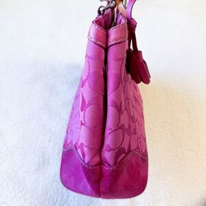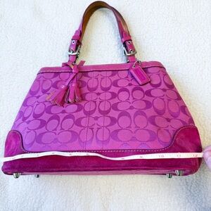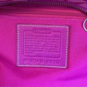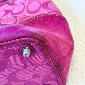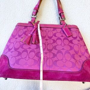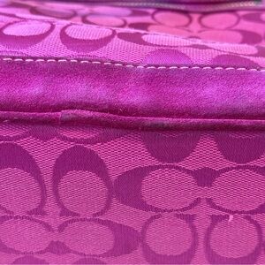 This vintage Coach hot pink Hampton tote bag is from 2005 and is in good used condition! There is discoloration on the suede, wear to some of the suede edges, small pen marks on the inside liner, a pen mark on the backside of one of the handles, and slight discoloration on the sides of the canvas. This bag is absolutely stunning and the color is incredible. There are no smells or odors, smoke free and pet free home. Measurements are provided in the photos.