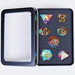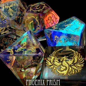 This is an exceptionally high-quality and stunning set of 7 glass dice featuring the phoenix bird, for the dice collector or RPG player that appreciates exquisite art. Every turn of the dice creates new colors from the reflecting light. This set comes in a cushioned gift box in which each die has it's own slot.
