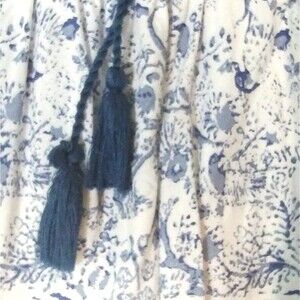 Embroidery Detail along front faux opening and around neck. matching tassels that are in great condition. 10" Wide gathered ruffle along hem.