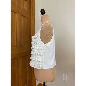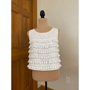 DO + BE Fringe Trim Semi Crop Sleeveless Top Size Medium; polyester and spandex. Approximate measurements laying flat, pit to pit- 18 1/2 inches x top of shoulder to bottom hem- 18 1/2 inches. Good condition, see photos.