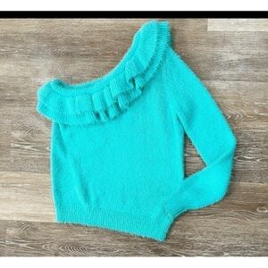 DO + BE Sz S Aqua Turquoise One Shoulder Fuzzy Ruffled Sweater NWT NEW