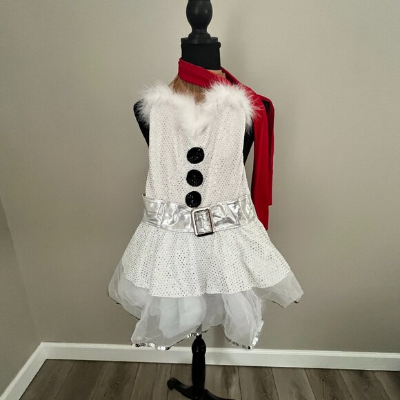comes with red scarf.. large bow and 3 buttons (one with double sided tape to keep on)