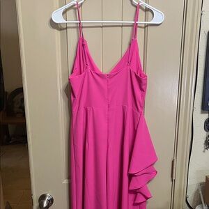 Vibrant pink jumpsuit with ruffled front. Spaghetti straps. Elegant and stylish.