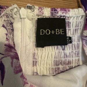 Chic dress with a purple floral design on white fabric. Features a stylish zipper closure.