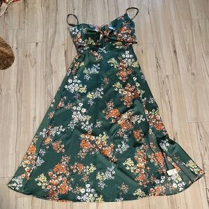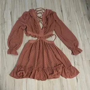 Chic rust dress with ruffle details. Features long sleeves and cut-out design. Perfect for any occasion.